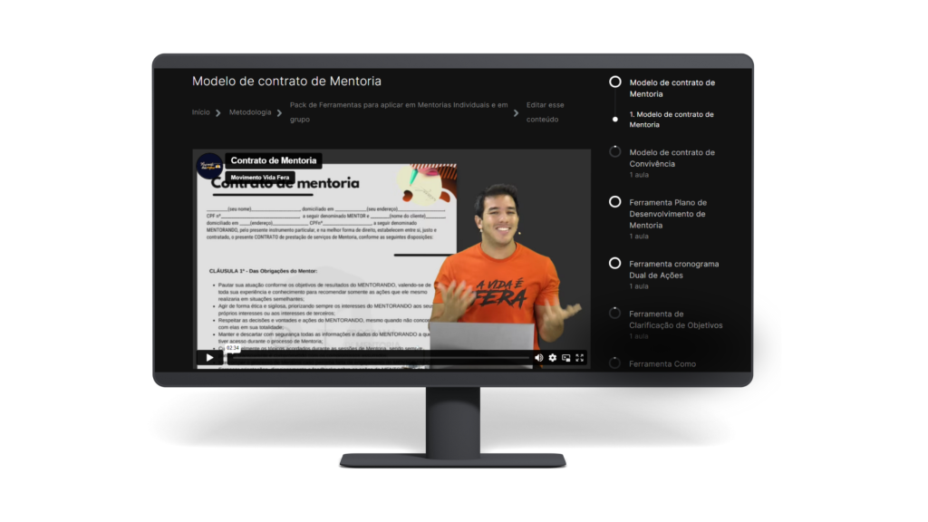 *Cada uma das mais de 30 ferramentas disponíveis são fornecidas em PDF com uma aula em vídeo de apoio explicando como aplicá-la. Você terá ferramentas de diagnóstico, recursos de implementação, checklists, Modelo de contrato de Mentoria, Modelo de contrato de Convivência, Ferramenta Relatório de Sessão de Mentoria e muitos outros recursos para facilitar sua atuação como Mentor! Obs.: Você consegue editar o material e colocar a sua identidade visual, para isso é necessário um programa de edição de PDF, como por exemplo o adobe.